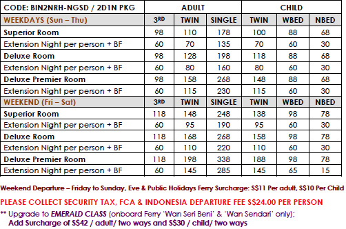 PACKAGE INCLUDES: - Return Ferry to Bintan - Two ways Terminal - Hotel - Terminal transfer - One night accommodation at Nirwana Resort Hotel...
