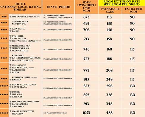 • Return Flight via Singapore Airlines (rate based on promotion airfare. subject to availability) •2 Nights’ Accommodation at your choice of hotel in Hong Kong •1 Night’s Accommodation at Felicity Hotel or similar in Shenzhen •1 Night’s Accommodation at Taipa Square or similar in Macau •Hong Kong, Shenzhen & Macau Half day city tour (Seat-In-Coach) •2 – way transfer Airport – Hotel – Airport (Seat-In-Coach) MACAU HOTEL UPGRADE: Venetian Hotel Royale Suite (Per Room Per Night) Sun - Thurs: S$230 I Fri: S$430 I Sat & Public Holiday: S$630 Surcharge: • [HONG KONG] Fri/Sat Weekend Surcharge: 5540 per room per night (Except Peak Day) • PEAK DAY SURCHARGE PERIOD: Jan 9 - 12/ Jan 28 - Feb 2 / Apr 6 - 9.13 - 16, 20 - 23/ Apr 27 • May 2 'NO FRI/SAT SURCHARGE ON PEAK DAYS PERIOD" • [MACAU] Fri Surcharge: S$95 per room per night I Sat Surcharge: S$115 per room per night • PEAK DAY SURCHARGE PERIOD: Jan 27 - Feb 2 / Apr 1 - 3.14 - 17 / Apr 29 - May 2 / May 27 - 30/ Jun 30 - Jul 2 - please contact us to check availablity for the above date • Child With Bed (3 - 11 years old) will be charged as adult's fare less S$20/pax • Child Without Bed (3 - 11 years old): $300/pax Terms & Conditions: • Travel Period: 3rd Jan - 6th July 2017 • All Rates quoted and sequence of tour and meals are subjected to change without prior notice • Black - out dates apply, Other terms and conditions apply • This package includes one suitcase (12"x18"x30") per pax & one free R/T transport (Airport<->Hotel) For luggage exceeding this limit, the additional one will be charged SGD 4.00. *Please take note, Triple Room means a roll away bed added into Twin Room, not a built in Triple Room* Airport Transfer Service: • Sit-in Coach Schedule from Airport to Hotels: First coach 07:15 to last coach 23:00 • Sit-in Coach Schedule from Hotels to Airport: First coach 06:30 to last coach 21:30 i. Pax who cannot catch the last sit-in coach (leaving airport al 23:00 sharp, have to arrange their own transport arrangement. ii) Special pick-up arrangement con be mode for group of 10 pax or up at a charge of SGD 20.00 per pax. Exclude • Airport taxes (opprox.S$85 subject to change with or without prior notice), visa, any personal expenses • Tour fare do not include any tippings for the guide & driver. Compulsory tipping of HKD 60 per pax for participation of Hong Kong half day tour / HKD30 for participation of Macau half day tour HKD50 for participation of Shenzhen half day tour • Meals not stated in the itinerary |